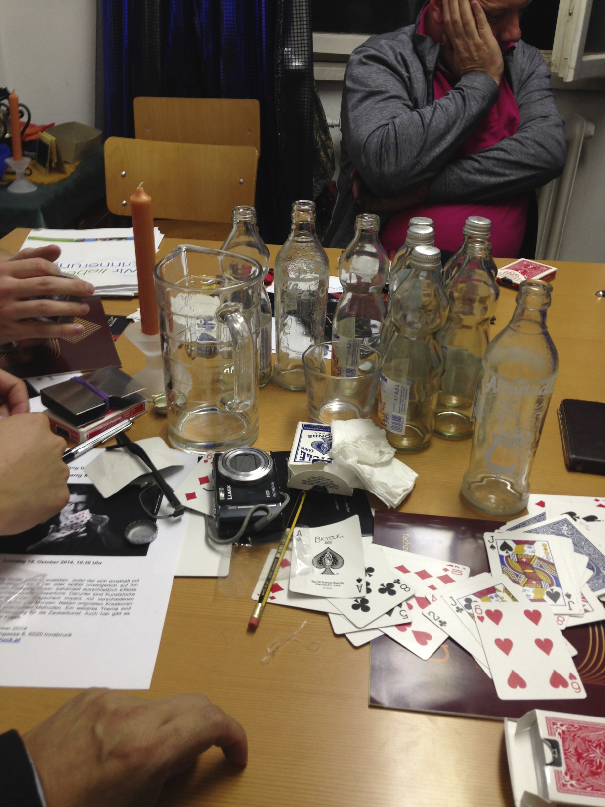 Tom kam direkt vom Jugendworkshop in St. Pölten. Nach ausgiebigen Gedankenaustausch ging es ringsum mit Zauberei. Inge zeigte eine Kartenwanderung unter den Po von Bernhard Klotz der schamhaft errötete. Tom zeigte eine sehr schöne Sandwich Routine, Dino ein sehr sauberes Kartenfinden mit zwei Joker, Hanno einen mentalen Effekt von Woody Aragon, Franz, der wohl seinen etwas zynischen Tag hatte, geizte nicht mir Ratschlägen zu den einzelnen Techniken. Der Höhepunkt waren aber zwei Wunderwerke der Technik: Ein Nachbau aus China um 4,50 Euro. Effekt: eine Mutter löst sich mit Windeseile von seiner Schraube. Alles kann untersucht werden.