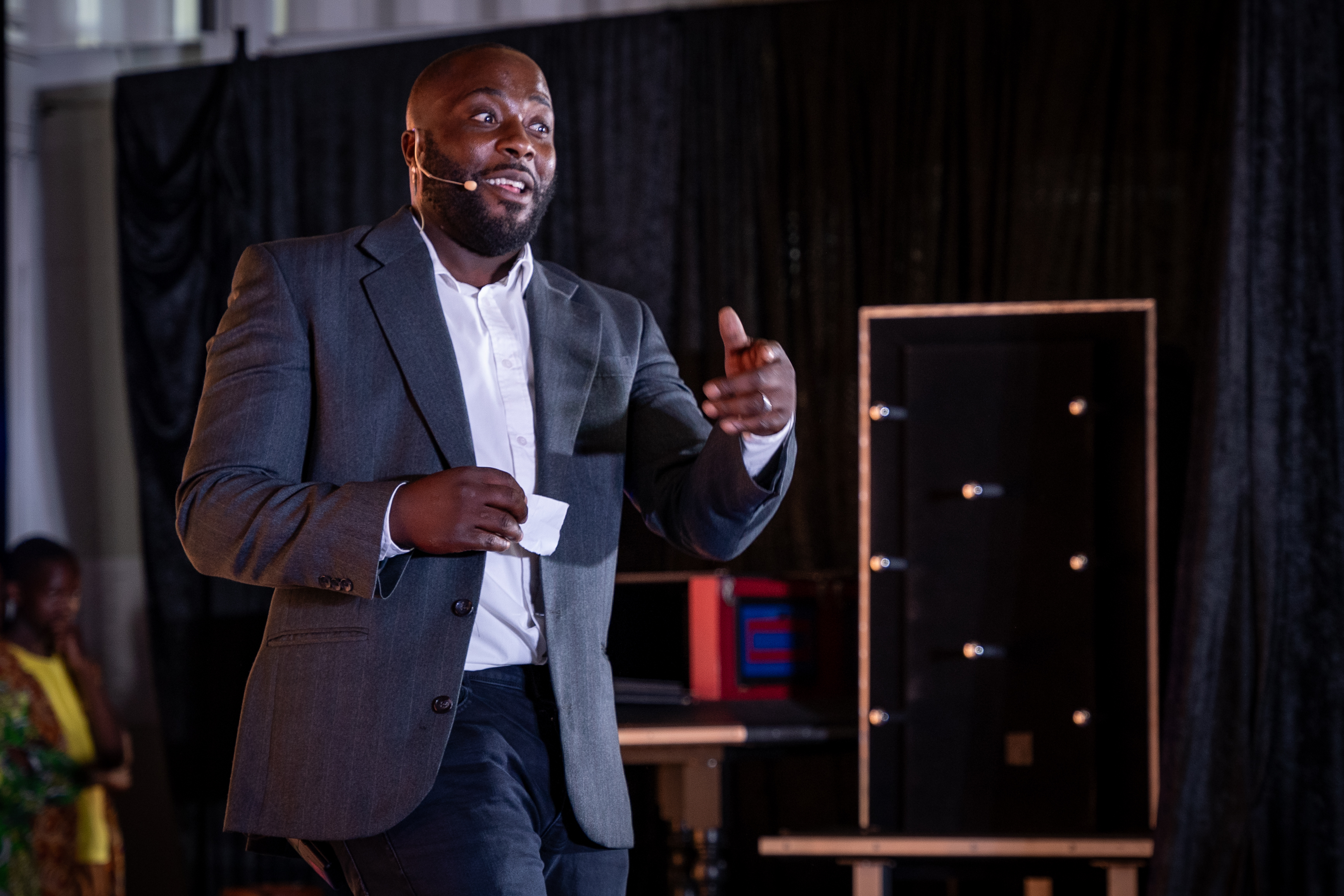 Janis von dem Borne – Flugkapitän und magischer Weltenbummler bezaubert mit Worten und erzählt von seiner 2023 organisierten Namibia Tournee, die durch 27 Theater ging.